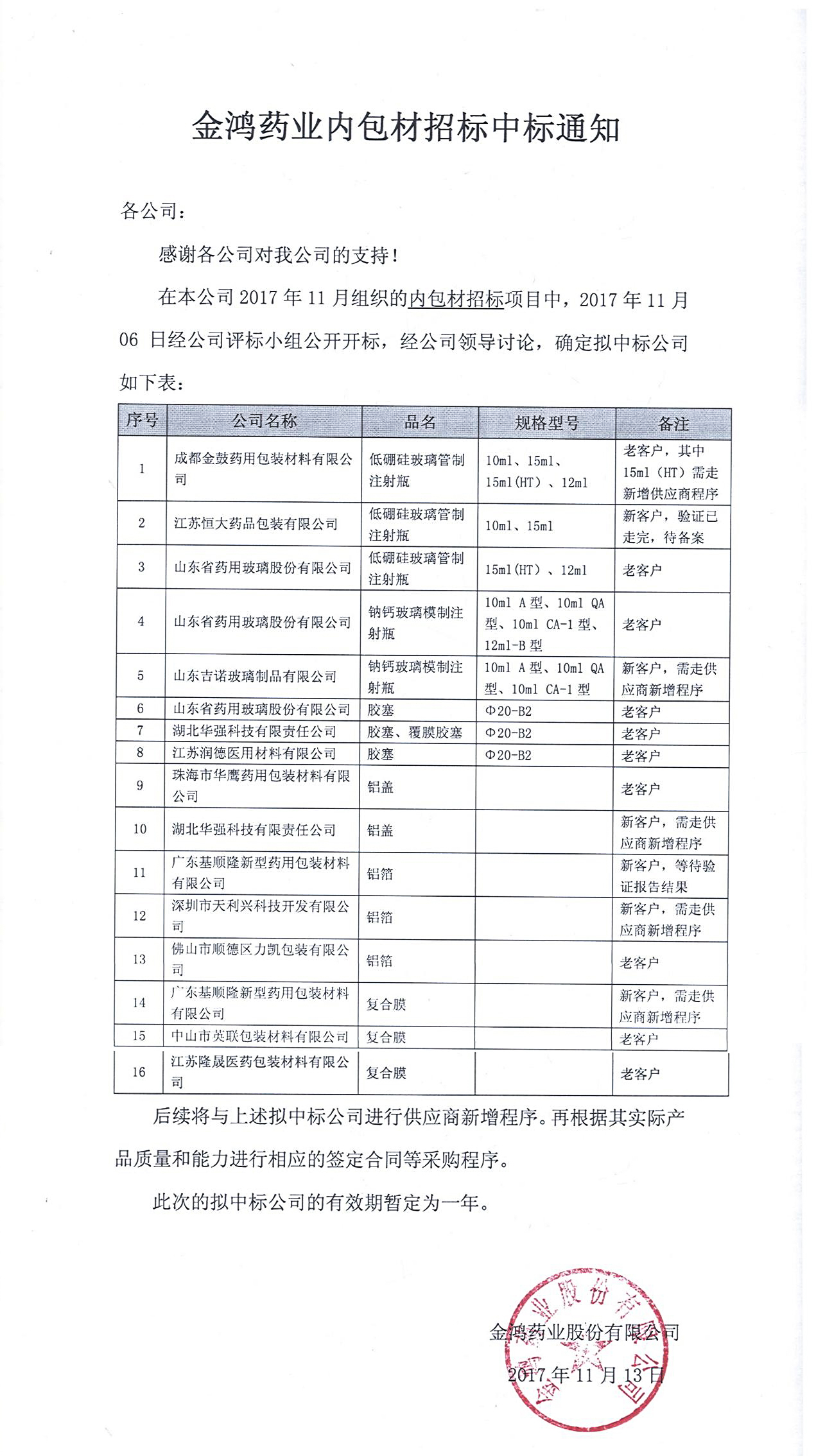 金鴻藥業(yè)內(nèi)包材招標(biāo)中標(biāo)通知