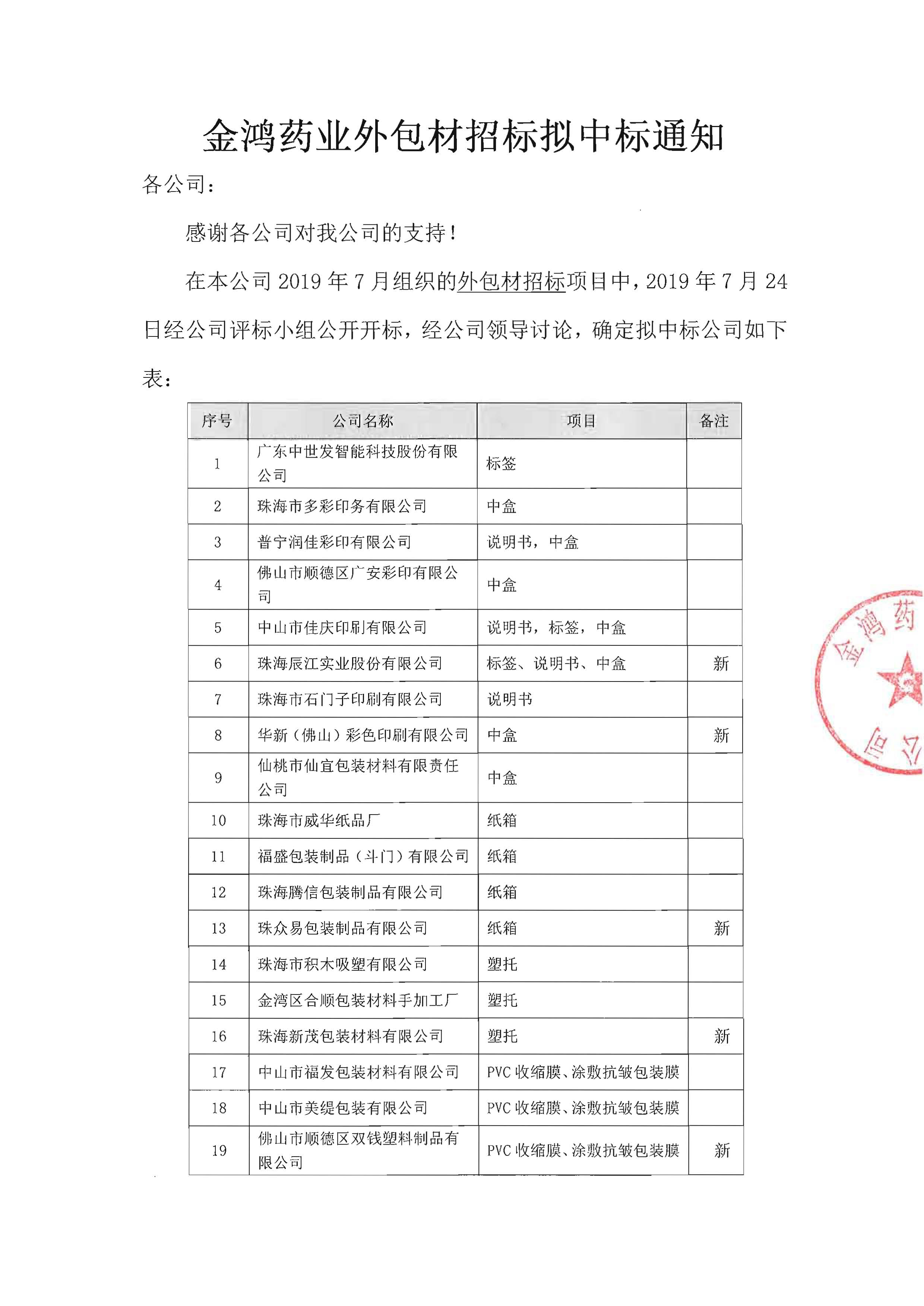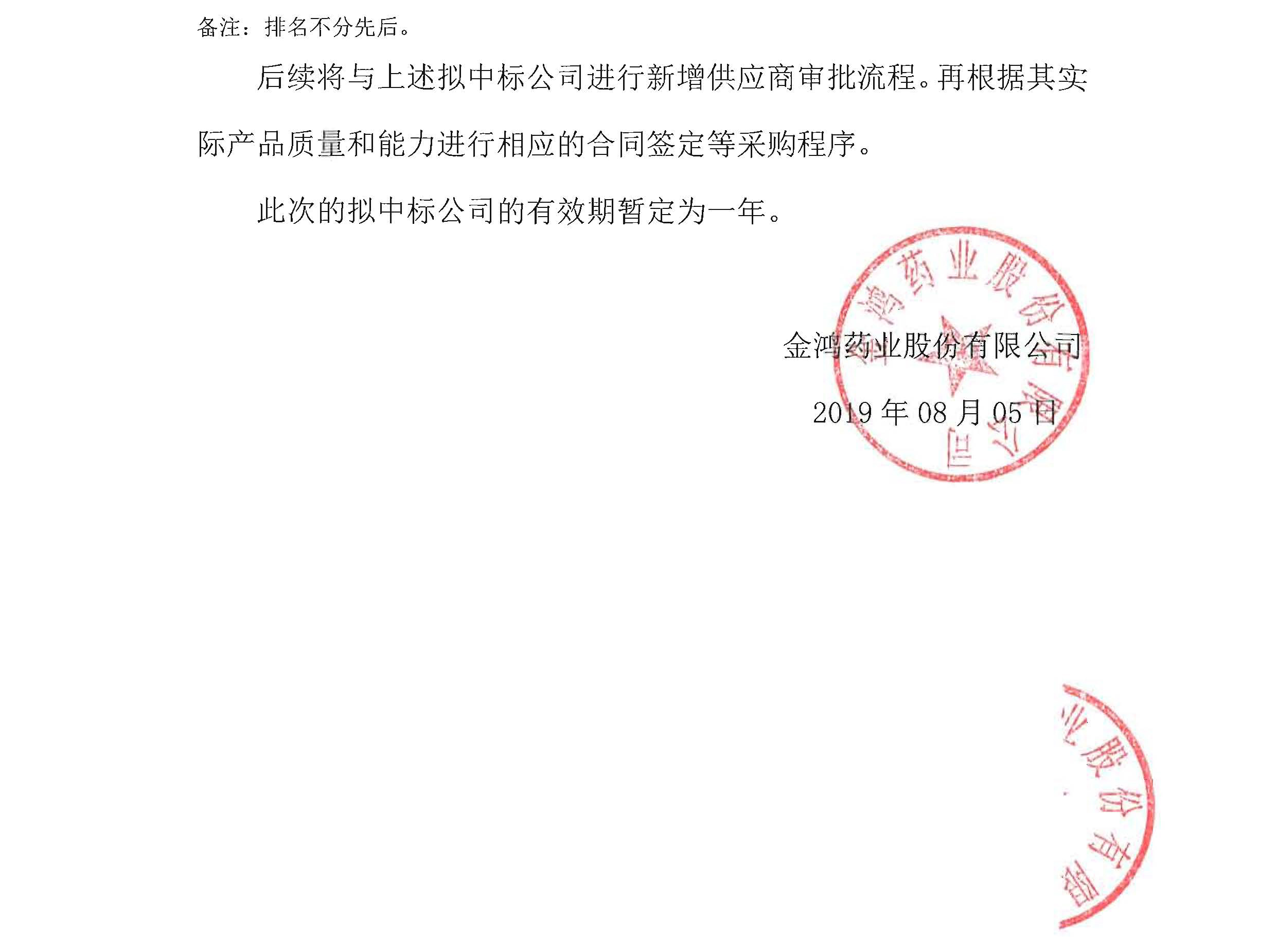金鴻藥業(yè)外包材招標(biāo)擬中標(biāo)通知