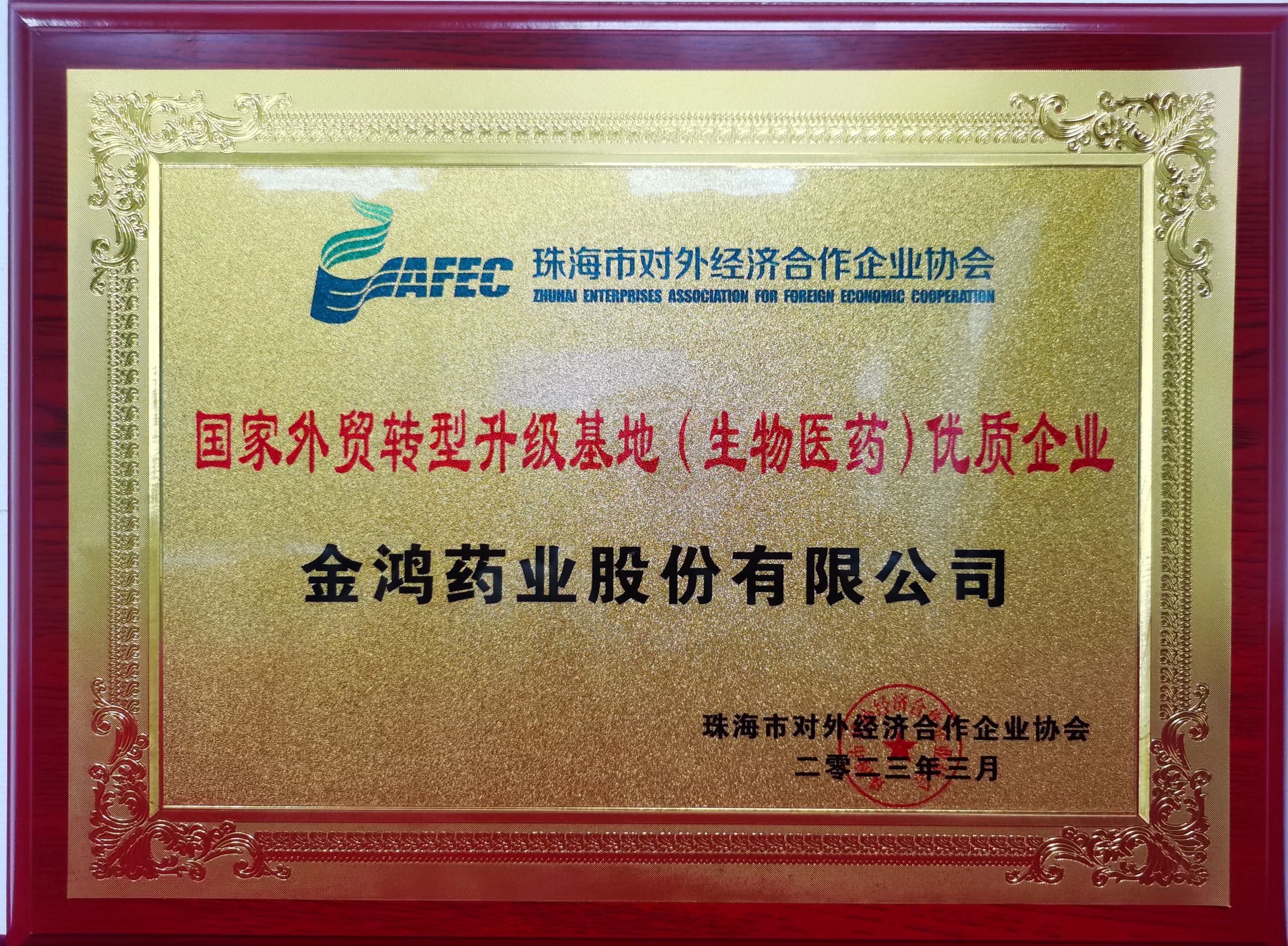 3月24日珠海市對外經(jīng)濟合作高質(zhì)量發(fā)展大會暨協(xié)會成立十周年慶典隆重召開。省、市、區(qū)各級相關(guān)部門領導及市對外經(jīng)濟合作企業(yè)協(xié)會全體會員單位代表共同參加。金鴻藥業(yè)被評為國家外貿(mào)轉(zhuǎn)型升級基地(生物醫(yī)藥)優(yōu)質(zhì)企業(yè),現(xiàn)場頒發(fā)榮譽證書和牌匾。